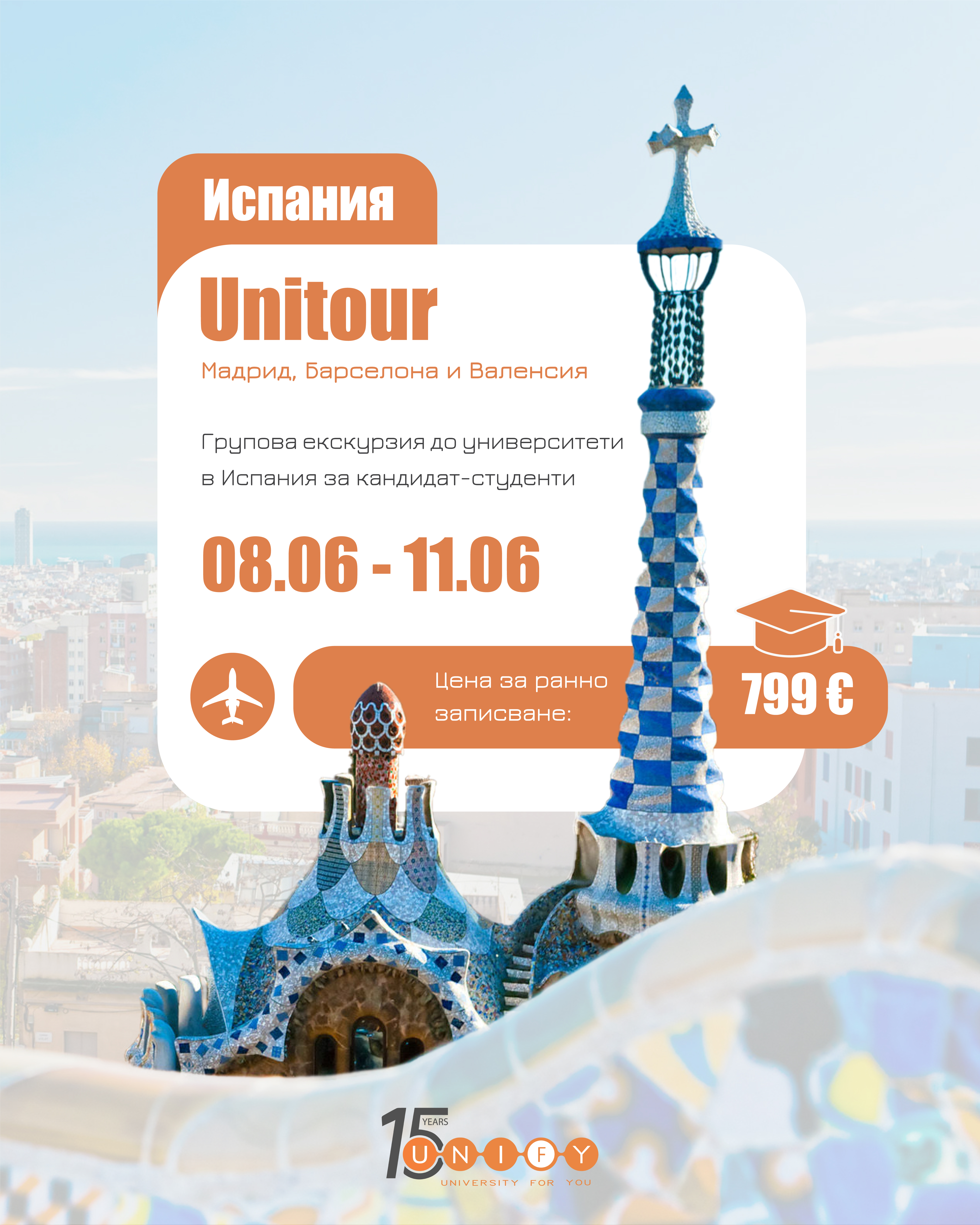 Unify организира UniTour - групово пътуване до Испания, което дава възможност на ученици и кандидат-студенти да посетят на живо едни от най-интересните международни университети в Испания, да се срещнат със студенти и преподаватели и да усетят атмосферата на обучението.