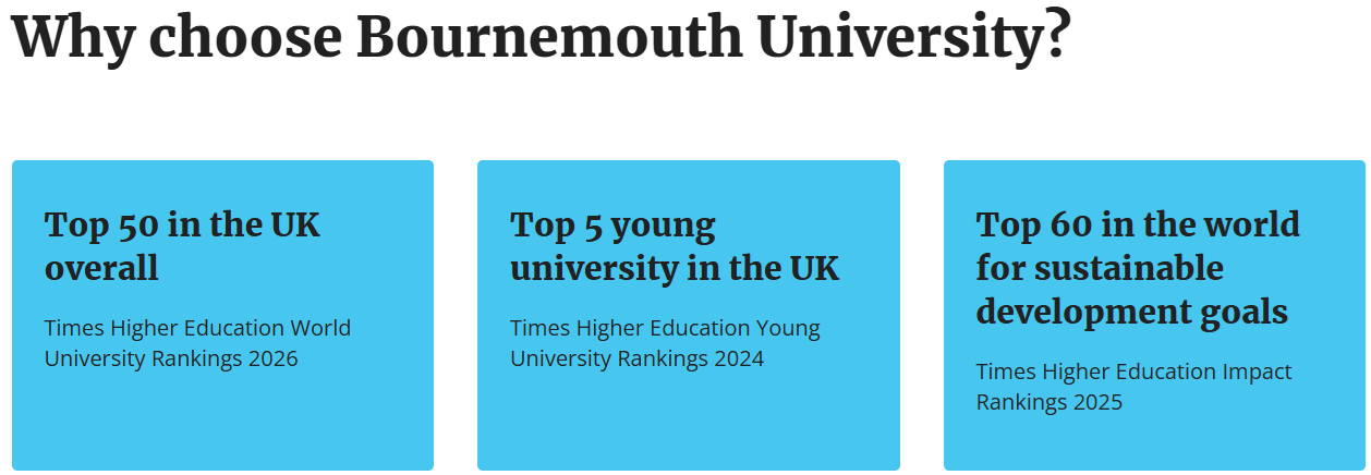 Bournemouth University (BU) е водещ публичен университет в Обединеното кралство (UK), разположен на южното крайбрежие в живописния град Bournemouth. Университетът се отличава с приложна насоченост, фокус върху професионалните умения, креативността и подготовката на студентите за глобалния трудов пазар. BU е известен с комбинацията от академична строгост и иновативни практическо-базирани програми, което го прави един от предпочитаните университети за международни студенти.