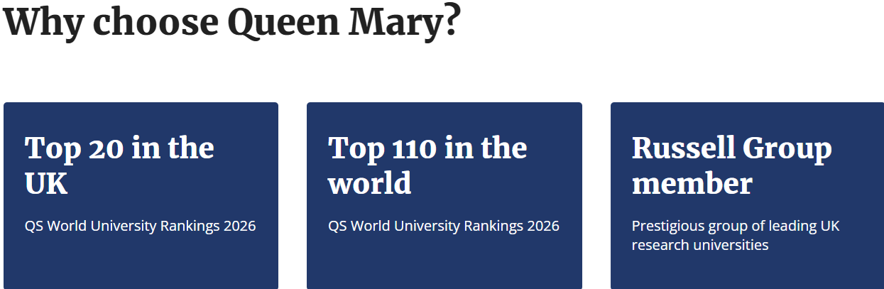 Queen Mary University of London е водещ изследователски университет в сърцето на Лондон, известен с международна студентска общност, практически ориентирани програми и силни връзки с индустрията и академичния свят.